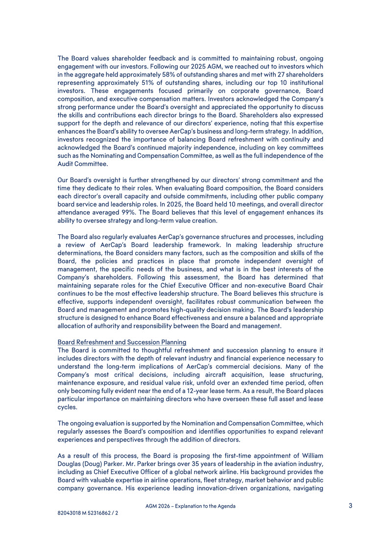 experience, noting that this expertise enhances the Board’s ability to oversee AerCap’s business and long-term strategy. In addition, investors recognized the importance of balancing Board refreshment with continuity and acknowledged the Board’s