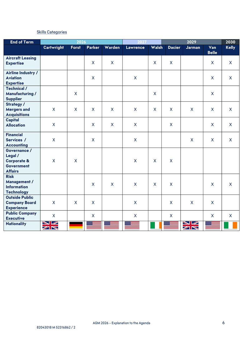 Term 2026 2027 2029 2030 Cartwright Forst Parker Warden Lawrence Walsh Dacier Jarman Van Belle Kelly Aircraft Leasing Expertise X X X X X X Airline Industry / Aviation Expertise X X X X Technical / Manufacturing / Supplier X X X Strategy /