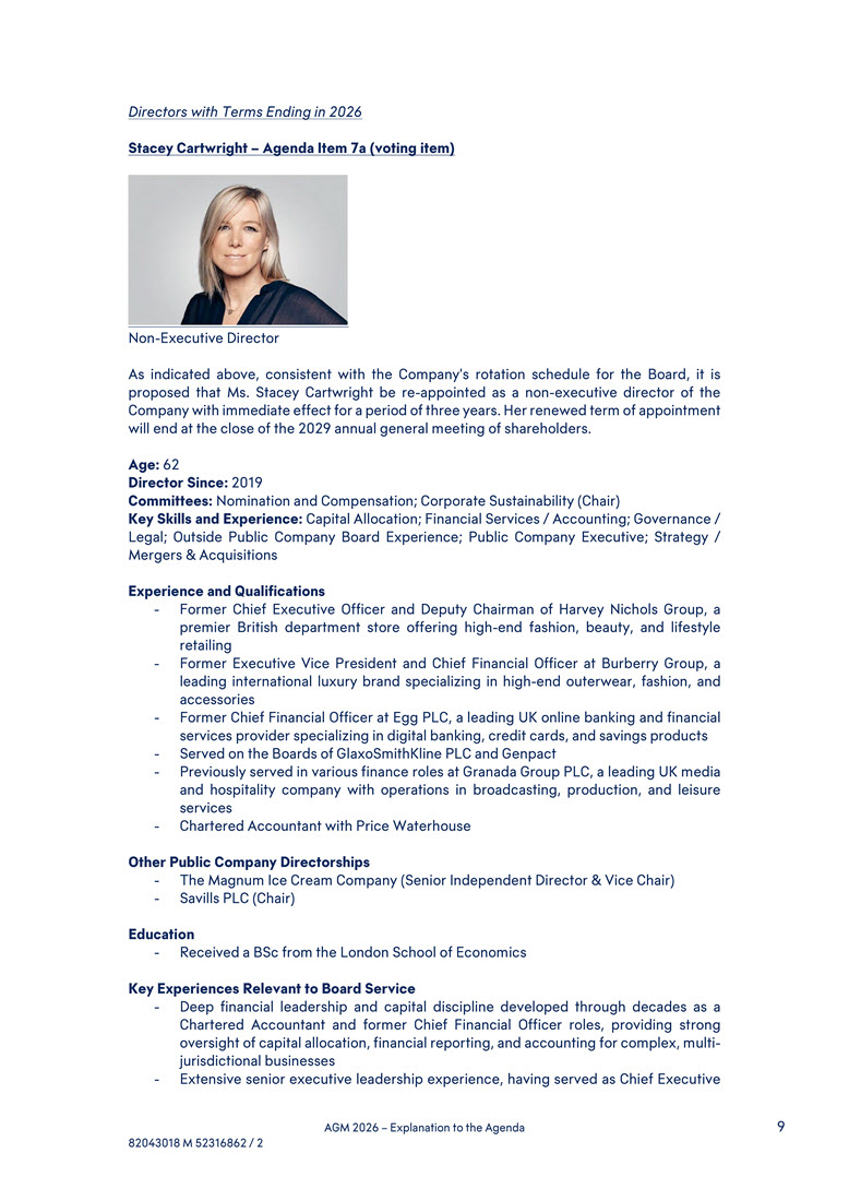 in 2026 Stacey Cartwright – Agenda Item 7a (voting item) Non-Executive Director As indicated above, consistent with the Company's rotation schedule for the Board, it is proposed that Ms. Stacey Cartwright be re-appointed as a non-executive