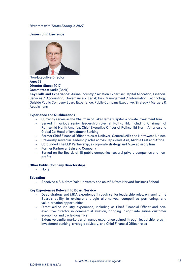 in 2027 James (Jim) Lawrence Non-Executive Director Age: 73 Director Since: 2017 Committees: Audit (Chair) Key Skills and Experience: Airline Industry / Aviation Expertise; Capital Allocation; Financial Services / Accounting; Governance / Legal;