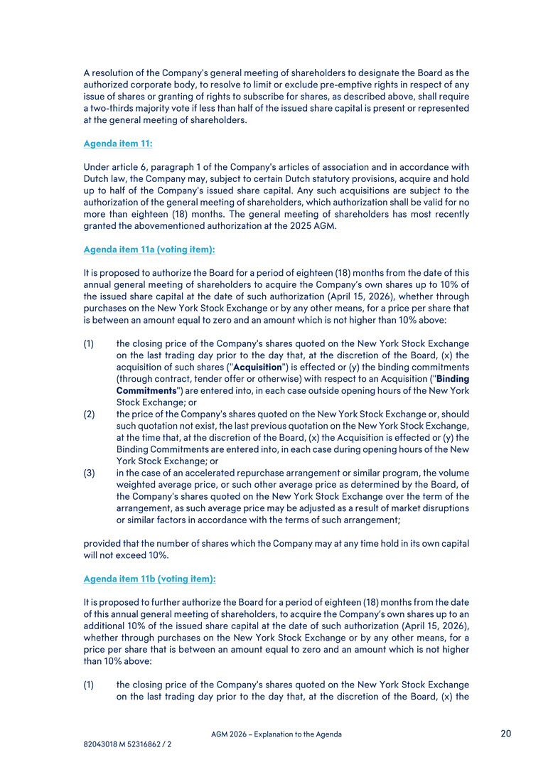 above, shall require a two-thirds majority vote if less than half of the issued share capital is present or represented at the general meeting of shareholders. Agenda item 11: Under article 6, paragraph 1 of the Company's articles of association