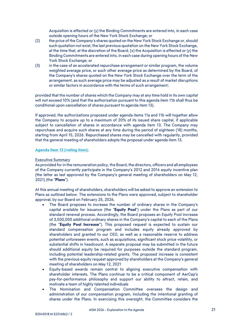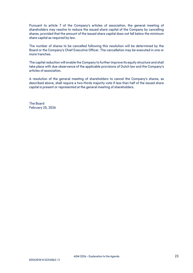 period of eighteen (18) months, starting from April 15, 2026. Repurchased shares may be cancelled with regularity, provided that the general meeting of shareholders adopts the proposal under agenda item 13. Agenda item 12 (voting item): Executive